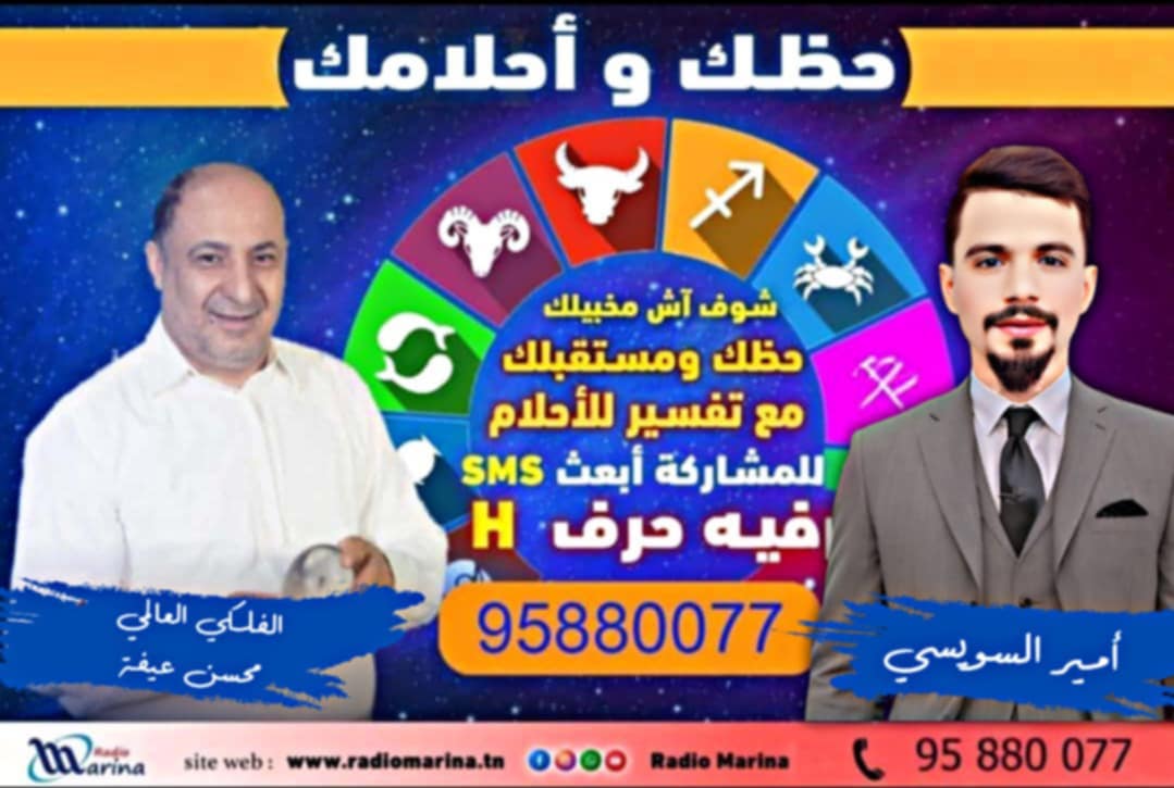 لكل عشّاق الفلك وتفسير الأحلام، لا تفوّتوا الموعد الأسبوعي المنتظر مع برنامج “حظك وأحلامك”، كل يوم ثلاثاء من الساعة السادسة مساءً إلى الثامنة ليلاً، على موجات راديو مارينا. رفقة الفلكي العالمي محسن عيفة والإعلامي المتميّز أمير سويسي، خوضوا رحلة مشوّقة بين الأبراج، الحظ، والأحلام. اكتشفوا ما يخبّئه لكم القدر، وتفاعلوا معنا مباشرة على الهواء! جوائز قيّمة في انتظاركم، من بينها قلادة جلب الحظ! كل ما عليكم فعله هو إرسال حرف H في إرسالية قصيرة على الرقم: 92770033 حظ موفق للجميع، وانتظرونا كل ثلاثاء على راديو مارينا