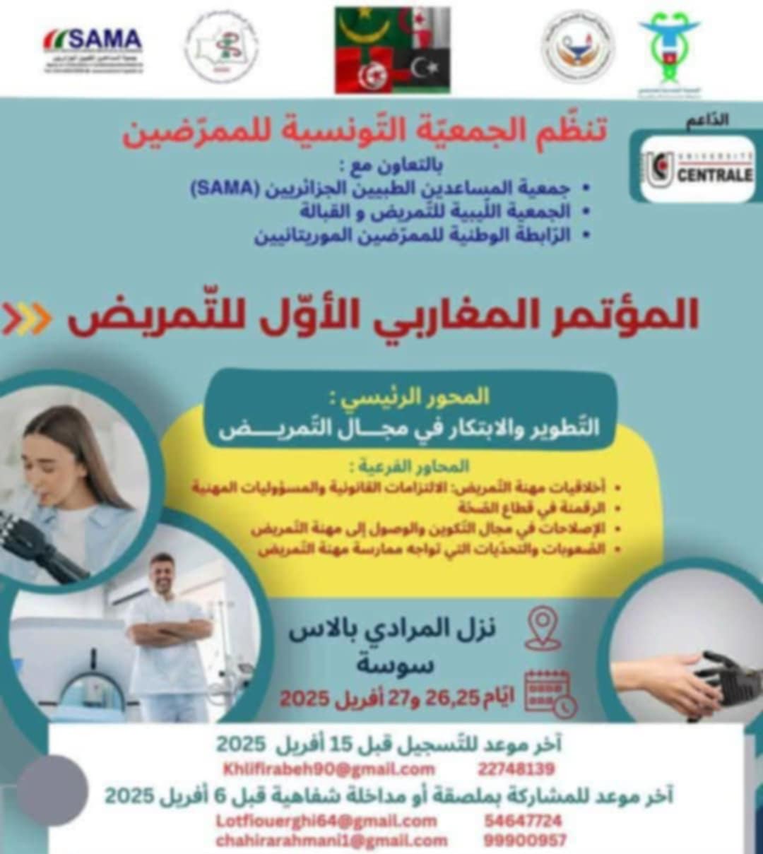 تختضن تونس نهاية الشهر الحالي المؤتمر المغاربي الأول للتمريض بمشاركة دولية بولاية سوسة حيث يهدف هذا المؤتمر حسب ما افاد به رئيس الجمعية التونسية للممريضين رابح الخليفي إلي تبادل الخبرات بين الممرض التونسي وزملائهم في البلدان المشاركة