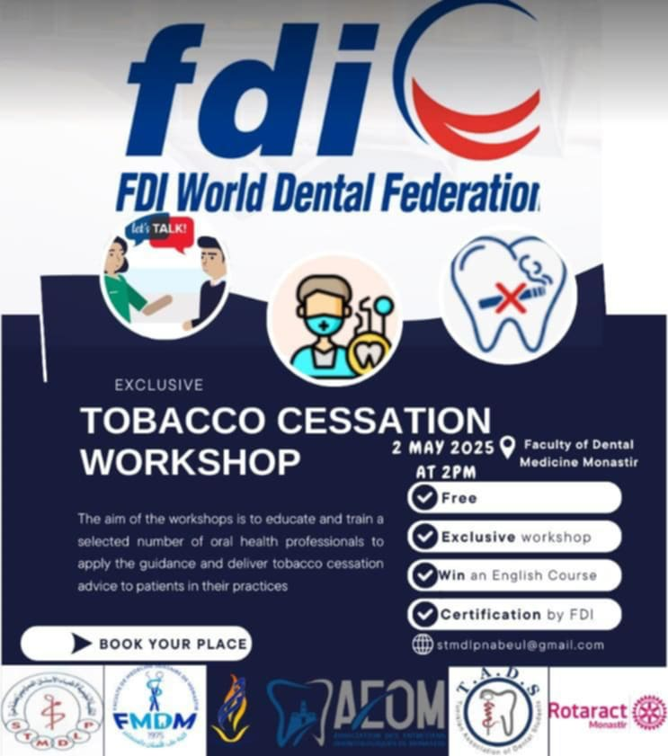 في إطار المؤتمر السنوي لكلية طب الأسنان بالمنستير، نظّمت الفدرالية العالمية لطب الأسنان (FDI)، يوم 2 ماي 2025، ورشة تدريبية حصرية بعنوان “الإقلاع عن التدخين”، وذلك بالشراكة مع عدد من الهياكل المهنية والجمعيات العلمية، وبمشاركة نخبة من مهنيي صحة الفم والأسنان. الورشة، التي احتضنتها كلية طب الأسنان بالمنستير، انطلقت على الساعة الثانية بعد الزوال، وسعت إلى تدريب عدد مختار من مهنيي القطاع على تقديم المشورة والدعم للمرضى الراغبين في الإقلاع عن التدخين، وفقًا لأحدث التوجيهات الصادرة عن الـFDI في هذا المجال.