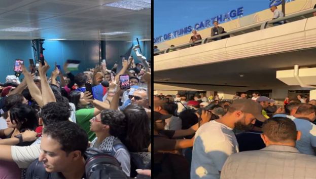 تدافع التونسيين على مطار تونس قرطاج لاستقبال المحررين المشاركين بأسطول الصمود