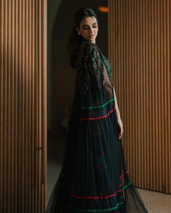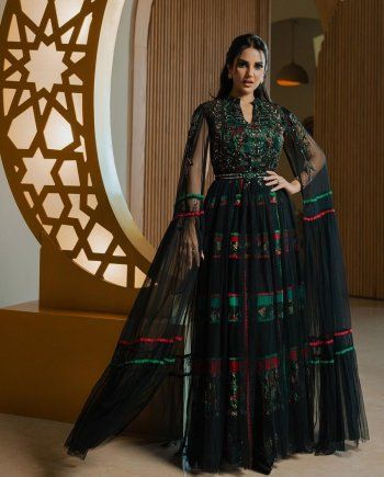 ويتميز القفطان أيضا بأكمام مشالح شفافة طويلة، وياقة دائرة، مع فتحة قصيرة عند الصدر، وهو من توقيع دار “Shalky” للمصمم السعودي قاسم القاسم.