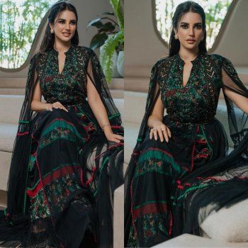 وخطفت درة الأنظار بإطلالتها، إذ ارتدت قفطان مميز باللون الأخضر، ويتميز بتداخل الألوان فيه من اللون البورغاندي والورود المطبّعة والمطرّزة على الصدر.