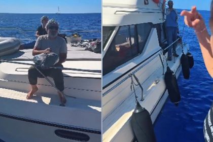 سفينة في المياه اليونانية توزع الغذاء على سفن أسطول الصمود